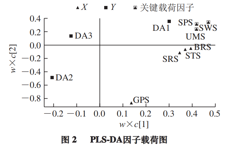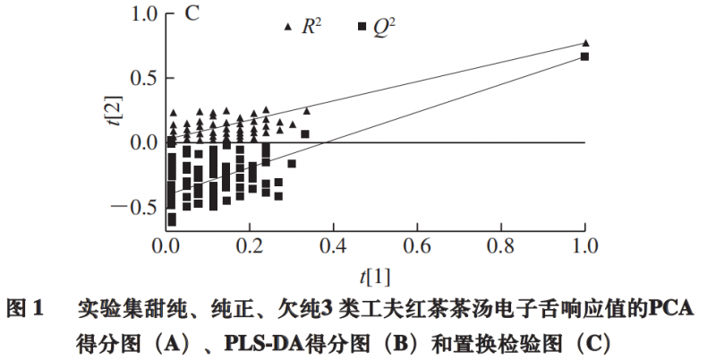 为探索电子舌检测能否用于工夫红茶茶汤滋味的判别,以电子舌7 个传感器响应值为X变量,以茶汤滋味分组(甜纯、纯正、欠纯)为Y变量做PLS-DA。PLS-DA是一种有监督的模式识别方法,相对于PCA所得的投影通常可获得更好的分类效果。如图1B所示,3 类(甜纯、纯正、纯)茶汤的聚类结果类似于PCA的结果(R2x =1,R2Y =0.61,Q2 =0.512)。Q2 大于0.5,表明模型具有较好的预测能力。过拟合是PLS-DA模型的一个常见问题。为进一步验证PLS-DA模型的可靠性,对该模型进行置换检验验证(图1C)。将模型建立时定义的Y矩阵的变量随机排列100 次,得到R2和Q2 截距分别为(0.0,0.029)和(0.0,-0.399),表明PLS-DA模型稳定可靠,未存在过拟合,可用于不同滋味的判别。