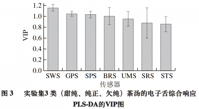 为进一步探明电子舌7 根传感器的响应值对滋味分组的贡献,筛选出影响甜纯滋味识别的关键传感器,将上述PLS-DA模型做载荷分析。如图2所示,对甜纯滋味识别影响较大的变量可能为SWS(甜)、UMS(鲜)、SPS(综合),其w×c值分别为0.47、0.42、0.42,以变量SWS(甜)贡献为最大。进一步采用变量投影重要性(variable important for the projection,VIP)筛选关键差异变量,如图3所示。结果表明,VIP值大于1.0的变量包括SWS(甜)、GPS和SPS(复合味觉)及BRS(苦),其中以SWS(甜)的VIP值为最高。SWS甜味传感器对甜纯组茶汤的响应显著高于纯正组和欠纯组(P<0.001),而对于纯正组和欠纯组的响应差异则不显著(图4)。上述结果表明SWS甜味传感器可能是识别甜纯滋味的关键因子。