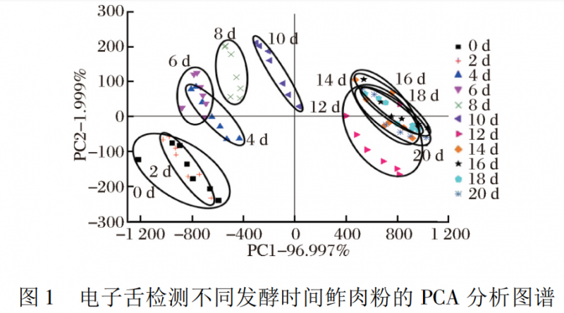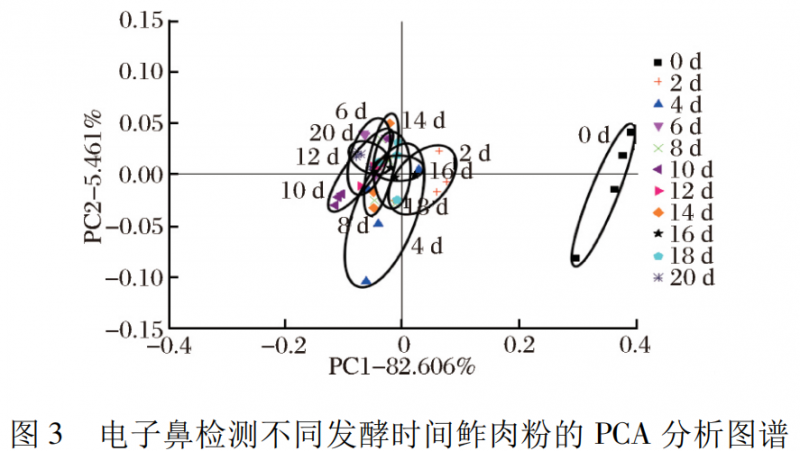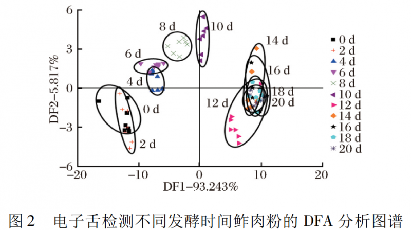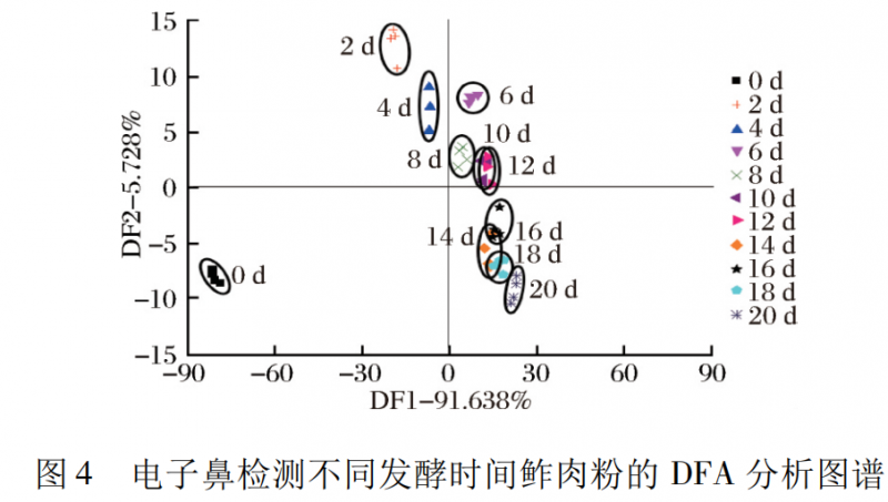 由图 4 的 DFA 图谱可知第一主成分贡献率为91.638% ,第二主成分贡献率为5. 728% ,2 种主要成分累积贡献率为 97.366% ( 超过 85% ) ,说明 2 种主成分包括鲊肉粉气味物质的大部分信息。从 DFA 图谱中可以看出第 0 天的鲊肉粉样品分布于左侧下半部分,显著区别于其他鲊肉粉样品; 发酵第 2 ~ 20 天,随发酵时间的延长,鲊肉粉样品逐渐向右下方移动,说明不同发酵时间的鲊肉粉的气味物质不同。发酵第 2 ~ 6 天从左上方向右下方移动且幅度较大,说明发酵初期鲊肉粉气味物质变化较大; 发酵第 8 ~ 12 天样品分布较集中,说明鲊肉粉气味物质比较类似; 发酵第 14 ~ 20 天样品部分重叠,说明鲊肉粉气味相近。