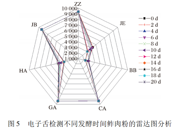 通过雷达图分析得出: 电子舌传感器 JE、BB、HA 的响应值随发酵时间的增加而呈规律性减弱,电子鼻传感 器 T40 /2、P30 /2、P40 /2、P30 /1、PA/2、T70 /2、T30 /1 响应信号的强度均随鲊肉粉发酵时间的增加而增加,电子鼻和电子舌变化呈相反的变化规律说明随着发酵时间的增加,鲊肉粉的风味物质减少,挥发性风味物质增多,故电子舌和电子鼻能很好的反映不同发酵时间鲊肉粉的风味品质的变化。