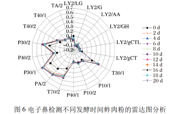 如图 6 所示,传感器 T40 /2、P30 /2、P40 /2、P30 / 1、PA/2、T70 /2 和 T30 /1 响应信号的强度均随鲊肉粉发酵时间的增加而增强,传感器 P30 /2、P30 /1、PA/2、 T70 /2 和 T30 /1 对各组鲊肉粉样品的响应值都较大,且发酵第 0 天和其他发酵时间响应值有差异显著,说明第 0 天的鲊肉粉样品中的挥发性风味成分与其他发酵时间的鲊肉粉样品显著不同; 传感器 LY2 /LG 的信号强度随鲊肉粉发酵时间的增加而减弱; 传感器T40 /1、TA/2、LY2 /G、LY2 /AA、LY2 /GH 和 LY2 / gCTL 对不同发酵时间鲊肉粉的响应值基本一致,传感器 LY2 /gCT、P10 /1 和 P10 /2 对不同发酵时间鲊肉粉样品的响应值虽有差异,但无明显规律。