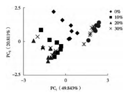 核桃油中掺入菜籽油的PCA分析图如图2所示。结果表明,第1主成分(PC1)的贡献率为49.843%,第2主成分(PC2)的贡献率为20.811%,2个主成分的总贡献率达到70.654%(>70%),表明所提取的信息能够反映原始数据的大部分信息。纯核桃油和其他掺假样品的数据点分布较远,区分明显,但是掺入菜籽油质量分数10%~50%的掺假样品的数据点分布较接近,各区域重叠严重,难以区分。这说明电子舌技术结合PCA分析方法可将掺假核桃油与纯核桃油区分开来。
