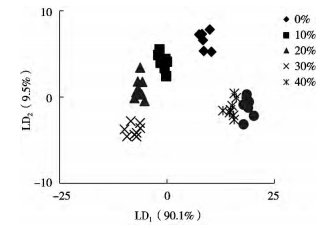 核桃油中掺入菜籽油的LDA分析图如图3所示。结果表明,纯核桃油和其他掺假样品的数据点分布较远,菜籽油质量分数0~50%的掺假样品之间也区分明显。核桃油中掺入菜籽油的含量不同,分布也不同,且分布位置随着菜籽油含量的增多呈现逆时针的变化,这表明不同掺假样品在菜籽油掺入质量分数大于10%时即能区分开来,且能通过掺假样品在LDA分析图中的位置判断出掺入菜籽油的质量分数,这表明电子舌技术结合LDA分析方法既能对核桃油中掺入菜籽油的现象进行定性分析,也可对其进行定量分析。