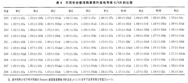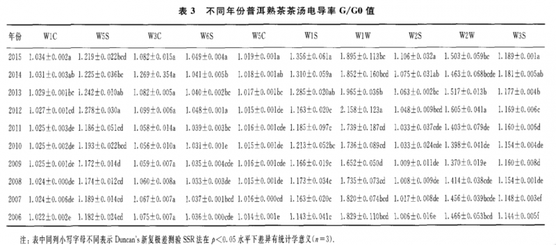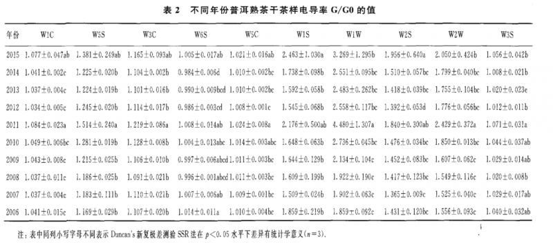 表 2至表 4为 10 个不同年份普洱熟茶的干茶、茶汤和叶底的具体的电导率 G/GO值。从表 2可知,对干茶香气 G/GO值最大的传感器是 w1w 和 W1S,其次是 w2w 和 W2S,其他 6个传感器的 G/GO值较低;对茶汤香气 G/GO值最大的传 感器是 w1w 和 w2w ,其次是 W1S和 W5S,其他 6个传感器的 G/GO值较低(表 3);叶底香气 G/G0值的贡献率大小顺序与茶汤的相同,即为传感器 w1w>w2w >w1s>w 5s(表4)。由表1所示的10个传感器的性能可知,W1S传感器对甲烷类挥发 性成分敏感,w1w ,w2w ,W2S和W 5S分别对硫化物,芳香成分、有机硫化物 ,乙醇和氮氧化合物等挥发性成分敏感。另外,不同年份普洱熟茶的香气物质不论 是干茶 、茶汤和叶底在其组成上基本一致 ,只是在干茶中乙醇气体比和氮氧化合 物更为丰富。总体来看,上述几类挥发性成分的含量在干茶中含量最高,茶汤次之 ,叶底最低;其中2011年干茶对 w 1s,w1w ,w2w ,W2S和 W5S传感器的电导率基本上是所有茶样中最高的。随着贮藏年份的增加,上述几类挥发性成分的含量 在干茶和茶汤中呈显著的上升趋势,在叶底中呈显著的下降趋势。