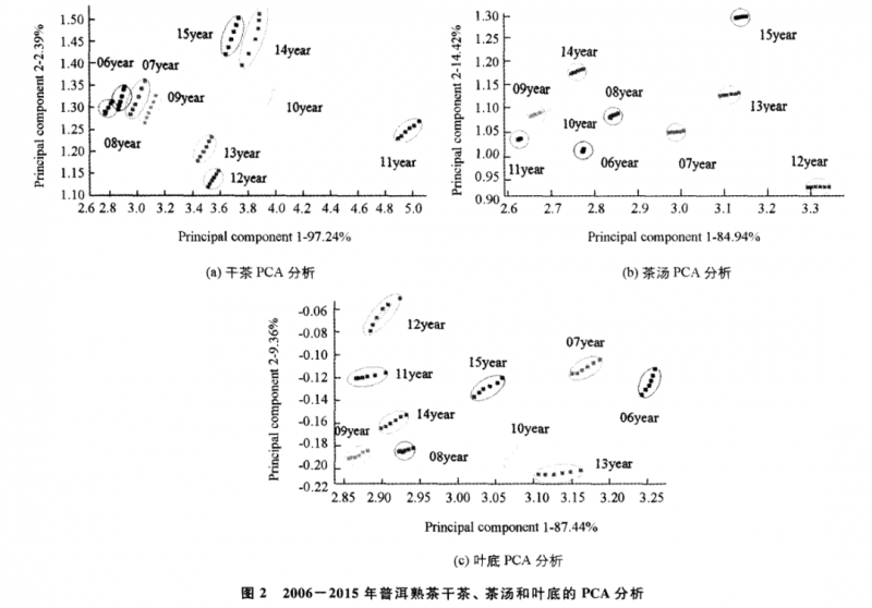 对干茶、茶汤和叶底香气物质进行 PCA 分析 (选取 55~60S的 6个检测信号 ),干茶 (图 2a)、茶汤 (图2b)和叶底(图 2c)的 PCA 分析结果显示:干茶 、茶汤和叶底 的第一主成分区分贡献率分别达到 97.24% ,84.94%和87.44 %,第二主成分区分 贡献率分别达到 2.39% ,14.42% 和 9.36 %,两个主成分区分的累计贡献率分别 达到 99.63% ,99.36% 和 96.80% ,说明这两个主成分已经基本代表了样品的主 要信息特征,PCA分析具有可行性。另外,在 PCA 的散点图中 ,不同年份普洱熟茶香气成分的数据采集点所在的椭圆形区域除2006年 至 2009年 的干茶之间以及 2009年与2010年的茶汤之间有部分重叠外 (图 2a,2b),其余的都分布在特定的区域中,说明不同储藏年份普洱熟茶的香气有较大的差异,PCA分析可以将不同储藏年份的普洱熟茶香气归类,并加以区分,且区分效果良好。