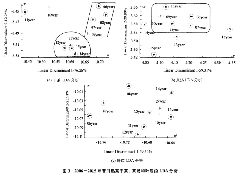 由 LDA判别因子分析图(图 3)可知,10个不同年份普洱熟茶干茶 (图 3a)的LinearDiscriminant1和LinearDiscriminant2的贡献率分别达到 76.26% 和 12.25% ,两判别式的总贡献率为 88.51%,相互之问都能明显的区分,香气的数据 采集点有不同的分布区域。其中 ,2010年和 2011年茶样相互之间的距离较远,2006—2009年的 4个茶样分布在距离较近的同一区域,2012~2015年 4个茶样也 同样分布在距离较近的同一区域,且两区域相互间距离较近,但两区域距离 2010年和 2011年的区域较远,且 2013年 和 2015年存在重叠现象,说明储藏年份相近 的普洱熟茶干茶中可能含有共同的香气物质,同时也说明随着储藏年份的增加香气成分会产生明显的变化,也说明 LDA法可以区分不同储藏年份的普洱熟茶,与 PCA 的分析结果相互验证 。茶汤 (图 3b)的 LinearDiscriminant1的贡献率达到 59.3l% ,LinearDiscriminant2的贡献率达到 29.90%,两判别式的总贡献率为 89.21% 。从图 3b可以看出,除 2012年和 2015年的茶汤香气数据采集点相互之问的距离较远外,其余的几个集中分布在离 Y=0最远的区域 ,且各个茶样都没有存在重 叠现象,说明茶汤的香气存在差异,且区分效果比干茶好叶底 (图 3c)的LinearDiscriminant1和 LinearDiscriminant2的贡献率分别达到 59.54% 和 23.94% ,两判别式的总贡献率为83.48% ,相互之间都能明显的区分,香气的数据采集点有不同的分布区域,且储藏年份相近的茶样分布在同一区域,说明储藏年份 相近的普洱熟茶叶底中可能含有共同的香气物质,同时也说明随着储藏年份的增加 香气成分会产生明显的变化。综上所述,无 论是PCA 分析还是 LDA分析,都能将 普洱熟茶香气较好地区分开,且 PCA 分析结果明显优于 LDA 分析结果,而且年份 差别越大,分离效果越好。