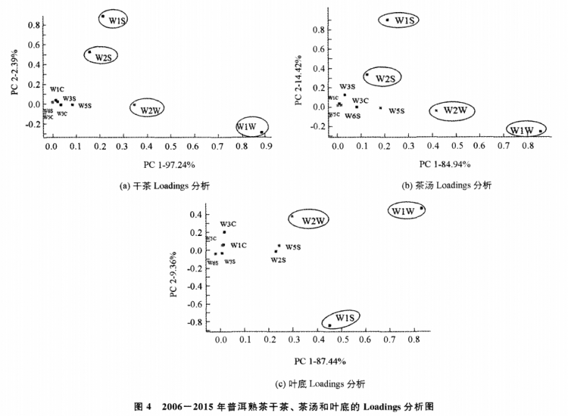 本研究中的Loadings分析法主要是对传感器进行研究,利用该方法可以确认特定试 验样品下各传感器对样品区分的贡献率大小,从而考察在样品区分过程中哪一类气 体起了主要区分作用。干茶的 Loadings分析结果如图 4a,传感器 w1w (对硫化物 敏感 )的位点距离x=0最远,说 明 W1W 对第一主成分的贡献率最大,传感器 W2W (对芳香成分 、有机硫化物灵敏 )次之;而传感器W1s(对甲烷敏感 )的位点距离 y=0最远,说明其对第二主成分贡献率最大,传感器 w2s(对乙醇敏感 )次之。茶汤的 Loadings分析结果如图 4b,传感器对主成分的贡献率与干茶的完全相同,即 w1w 对第一主成分的贡献率最大,传感器 w2w 次之;而传感器 w1S对第二主成分贡献 率最大,传感器 W2S次之。叶底的 Loadings分析结果如图 4c,传感器 w1w 的位 点距 x=0和 y=0都较远,说明其对第一、第二主成分的贡献都较大,而 w2w 距y=0最远,说明其对第二主成分贡献率最大,传感器 w1s对第一主成分的贡献次于 w1w。
