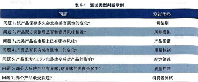 当企业在新产品开发环节中运用到感官评价时,研发人员以及营销人员会针对感官分析师提出很多问题。在企业运用中,我们根据目的可以将感官评价分为以下几类:货架期、配方筛选、产品图谱、质量控制、风味模拟、消费者测试,见表6-1。