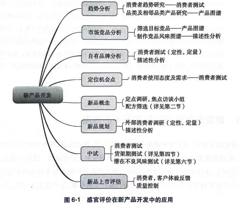 完整的新品开发流程具有很多环节,其中包含产品趋势分析,自有品牌分析,新品概念的生成,产品线规划,中试以及新品上市放行等。因此,在新品开发中感官评价的方法是综合性的,即多个感官测试贯穿于整个新品开发流程中。常见方法分布见图6-1。