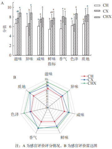 对不同食用菌素肉排各传感器的味觉响应值进行整理分析(图2A)并绘制滋味雷达图(图 2B)。结果表明,3 种素肉排对电子舌不同传感器的响应值有明显差异,响应强度为丰富性(鲜味回味)>鲜味>咸味>苦味>涩味,3 种食用菌素肉排滋味图谱相似,具有类似的滋味组成。