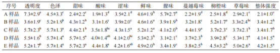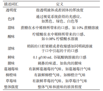 表1 不同口味胶原蛋白固体饮料的感官描述词汇表2定量描述分析结果