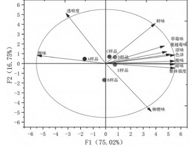 本研究对不同果味的胶原蛋白肽固体饮料的透明度、色泽、甜味、酸味、涩味、鲜味、腥味、蔓越莓味、柳橙味、草莓味和整体强度进行了主成分分析,当提取到2个主成分,累积的方差贡献率达到91.77%,说明这2个主成分可以涵盖不同果味胶原蛋白固体饮料的大部分信息。如图2所示,不同果味胶原蛋白固体饮料分散在各个区域,两点之间距离越长,说明两个样品的整体感官品质差异越大;同时两点距离越短,说明两个样品间感官品质含量差异越小,感官品质较为相近。从PCA图中,可以直观地看到5款样品的感官属性各具特点。其中A样品与其他样品差异最大,故分布于F1的负半轴,风味特征主要表现为腥味强、透明度高,其他感官属性不明显。B样品的风味特点主要为柳橙味比较强,故分布在F2的负半轴;C、D和E样品分布距离比较近,其特征表现为透明度、色泽和甜度等感官属性比较接近。