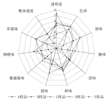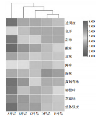 对不同果味胶原蛋白肽固体饮料的感官属性强度进行热图聚类分析的结果见图3。5种样品大致可分为3类,即C、D和E最先聚为一类,其透明度、色泽和甜味等方面的感官性质较为相似,说明蔓越莓味和草莓味在感官上整体相似;第二类为B样品,其柳橙味和色泽较为突出;第三类为A样品,其在透明度表现最突出,这与主成分分析呈现了相同结果。同时发现A样品为纯胶原蛋白肽粉呈现出的腥味较浓,而B、C、D、E这4款胶原蛋白肽固体饮料样品腥味较淡,这4款产品配方中添加了果粉,说明果粉有效掩盖了胶原蛋白肽的腥味。