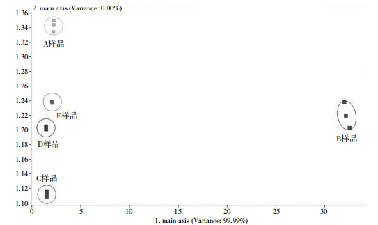 5 电子鼻分析结果 利用电子鼻对5种不同果味胶原蛋白肽固体饮料的挥发性成分进行测定后,将采集得到的数据进行主成分分析,分析结果如图4所示。第1和第2主成分的累积贡献率达到99.99%,说明电子鼻对其挥发性成分表现出较高的识别度和灵敏度。总体看,各样品的挥发性成分有各自的分布位置,基本没有重合,说明电子鼻对于5种样品气味的区分度总体较好,所有样品的风味相对独立,原因可能是因为不同果味胶原蛋白肽固体饮料的配方组成存在一定差异,所以在不同果味胶原蛋白肽固体饮料形成的挥发性成分亦有所不同。C、D和E样品在第1主成分上的相距较近,但在第2主成分上能完全区分开,说明草莓味和蔓越莓味的胶原蛋白肽固体饮料的气味上略有相似,而B样品在第1主成分上与其他样品相聚甚远,说明柳橙味的胶原蛋白肽固体饮料气味与其他样品差异最为明显。根据感官结果发现A样品在气味上主要呈现腥味,B样品为柳橙味的胶原蛋白肽固体饮料与A样品在气味上相差甚远,从电子鼻分析结果得出,柳橙味的果粉相比较蔓越莓和草莓味的果粉的掩腥效果更好。