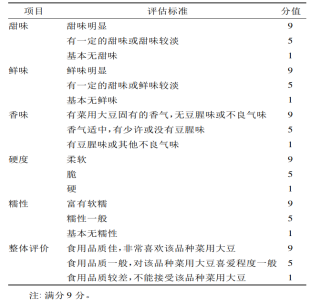 感官评定小组由江苏省农业科学院豆类研究室的8名老师及研究生组成。采用9分嗜好法对菜用大豆进行感官评定,1、5、9分分别表示极度不能接受、一般、非常喜欢。结果表示为评分的平均值。感官评定标准详见表1。