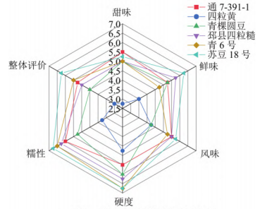 菜用大豆感官评价结果如图1所示。通7-391-1甜味值最高,为5.50,甜味明显。苏豆18号在鲜味( 6.25)、香味( 5.75)、糯性( 6.75)、硬( 6.75)方面得分最高,而且综合平均得分最高,为6.25,说明从整体来看,苏豆18号具有菜用大豆固有的香气,鲜味,口感软糯滋味相对较好。四粒黄得分最低,为3.67,且与其他样品的得分离散程度最大,说明口感滋味不符合大众喜欢。