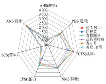 2.2电子舌味觉属性分析菜用大豆酸味、苦味、甜味、鲜味及咸味5种味觉属性值见图2。在5个味觉属性中,菜用大豆鲜甜咸味较为突出。从鲜味值来看,苏豆18号的鲜味的响应值为2947.47,高于其他5个品种的响应值。在甜味的响应值上,响应值范围在2975.50~3472.11,各样品甜味响应值从大到小依次为通7-391-1为3472.11、苏豆18号为3427.22、邳县四粒糙为3352.83、青6号为3344.78、青棵圆豆为3297.19、四粒黄为2975.50,与感官评价各样品鲜甜味数值大小排序一致。从味觉响应值数据中我们还可以看出,电子舌分析的结果和感官评价评分的结果具有一定相关性。