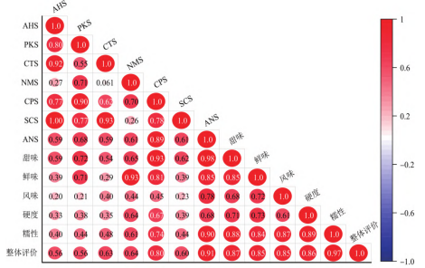 2.3电子舌和感官评价相关性分析利用皮尔逊系数对菜用大豆电子舌评价值和人工感官评价得分进行相关性分析,结果如图3所示。从图中可以看出,电子舌酸味与咸味和苦味呈极显著正相关,相关系数分别为0.919、0.996。咸味与苦味呈极显著正相关,r>0.930。同时,在感官评价中,发现对菜用大豆的整体评价与其甜味、鲜味、风味、硬度和糯性均呈现高度相关性。说明整体食用品质较好的菜用大豆,必然呈现鲜甜软糯,具有大豆固有的清甜香味。值得注意的是,电子舌鲜甜味与人工感官评价的鲜甜味关联度较高,电子舌鲜甜味与感官评价鲜甜味呈极显著正相关,鲜味相关系数达0.926,甜味的相关系数达到0.983。说明电子舌与感官评价对菜用大豆的滋味品评具有一致性,尤其体现在菜用大豆的甜味和鲜味2个味觉属性。