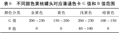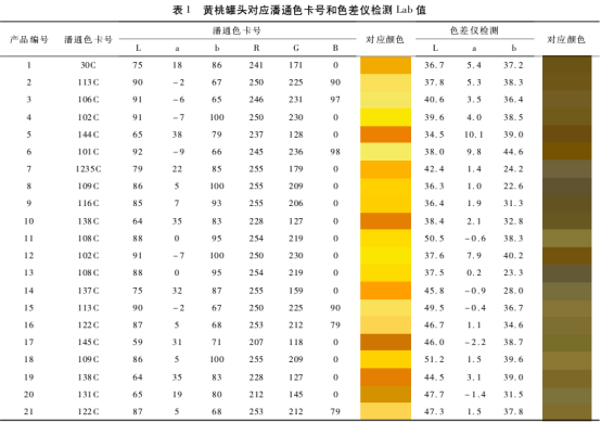 为了减少其他因素的干扰如品牌、价格、广告、经验等方面的影响,本实验决定采用双盲法进行检验。所有的样品都用3个随机的数字进行编码,检验样品也随机化。在进行试验之前罐头要先打开5min,再将桃片放在白色瓷盘上。由训练型评价员以潘通色卡为参比物,寻找和黄桃罐头相对应的色卡,记录下其Lab值和RGB值,然后再由训练型评价员根据经验,按照金黄色、黄色、浅黄色、暗黄色将其分为四类。
