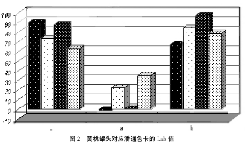 将黄桃罐头打开将桃瓣放在白色磁盘上,将产品放置在色差仪的光圈内,每个桃瓣测三个点,每罐取3个桃瓣,结果取其平均值。其中L表示亮度,+a表示偏红,-a表示偏绿,+b表示偏黄,-b表示偏蓝。