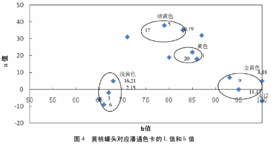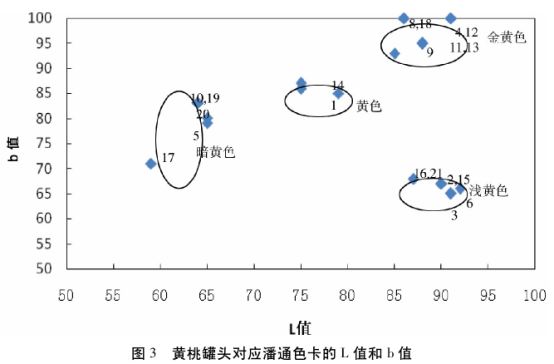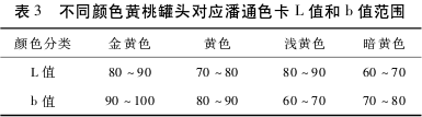 黄桃罐头对应潘通色卡L值和b值分布见图3,可以看出金黄色b值最大在90~100之间;浅黄色b值最小,在60~70之间,黄色b值在80~90之间,暗黄色b值在70~80之间。金黄色L值范围80~90之间,黄色L值在70~80之间,浅黄色L值最大在80~90之间,暗黄色L值在60~70之间。
