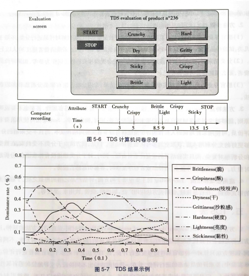 TDS(temporal dominance of sensations)法是一种时间-强度(TI)方法的延伸,这两种方法都是随着计算机系统的应用而逐渐得以实现并发展的,均是动态感官评价的方法,不同的是时间-强度方法只针对一种感官属性的强度进行评价,而TDS法是针对多个感官属性进行评价。在TDS 实验中,要求评价员动态的进行评价,并在一段时间内给出不同阶段占主导地位的感官属性,主要感官属性不一定是强度最大或者较大的感官属性,关于主要感官属性的定义有:能够引起注意的感官属性、持续增加并突然能被感知的感官属性。感官专业人员通过分析实验结果,从而获得不同样品的主要感官属性描述图,常见的结果呈现方式是TDS曲线。问题和结果示意图见图5-6、图5-7。