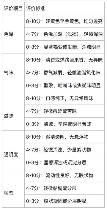 感官评价标准依据GB 2716-2018《食品安全国家标准 植物油》制定(表1)。实验前对评价小组成员进行系统培训,通过理论讲解与样品比对,确保其精准掌握核桃油在不同氧化阶段的色泽、气味及滋味特征。样品评价流程:取20 mL油样于透明玻璃烧杯中,在自然光线下记录其色泽与透明度;随后将样品置于50 ℃恒温水浴中加热10 min,玻璃棒匀速搅拌后,立即嗅闻挥发性气味特征。滋味评价前,评价员需以温开水漱口,取5 mL油样于口腔内缓慢含漱,重点感知酸败、哈喇味等异常风味。每份样品由 12 名小组成员独立评价,结果(十分制)以去掉最高分和最低分后取平均值为准,结果保留两位小数。
