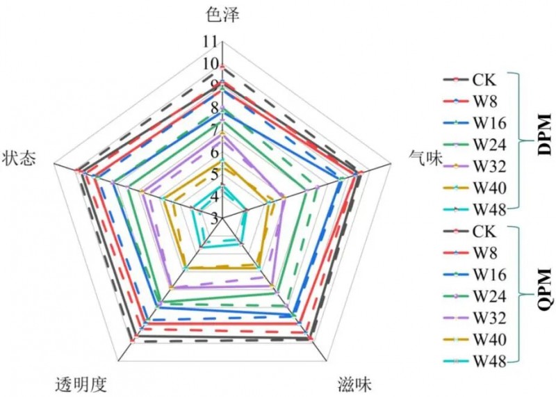 图1为两种核桃油随贮藏时间延长得到的感官评分雷达图,DPM和QPM核桃油感官品质在贮藏0周感官评分相近且处于较高水平,分别为9.50分和9.80分,表明初始品质良好。随着贮藏时间延长,两者感官评分均呈下降趋势,其中QPM从第8周开始呈现显著的下降趋垫,而DPM则从第16周开始呈现显著下降趋势(P<0.05),目整个贮藏过程中,QPM的下降幅度总体大于DPM。推测可能是庆为去仁衣核桃油更易发生氧化、水解等反应,产生如醛、酮、游离脂肪酸等异味物质,从而导致风味、色泽和气味等感官品质的快速劣化;相比之下,DPM的感官评分下降相对缓慢,这很可能得益于核桃仁衣中含有多种抗氧化成分的保护作用,它们可以有效清除自由基,减缓氧化反应的进行,进而延缓感官品质的下降。然而,QPM的色泽在初期明显优于DPM,这可能与核桃仁衣中的色素在压榨过程中溶出有关,使得DPM颜色较QPM略深且透明度较差。